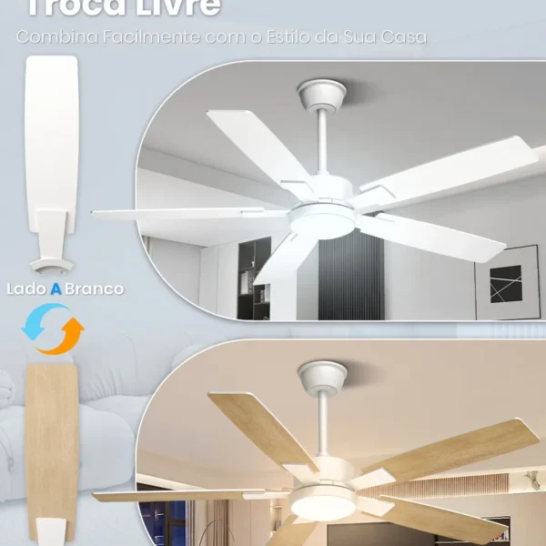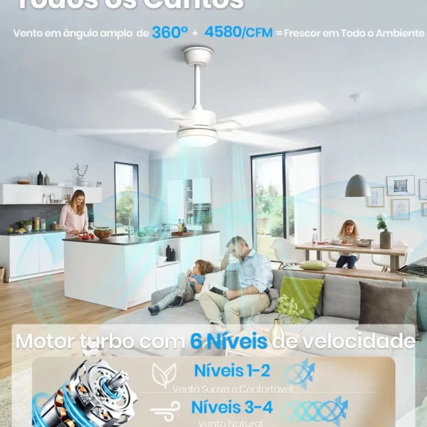 Com luz LED 18W, 3 temperaturas de cor, 6 velocidades e timer inteligente, ele entrega conforto diário para sala, quarto e escritório, com visual moderno e acabamento premium.